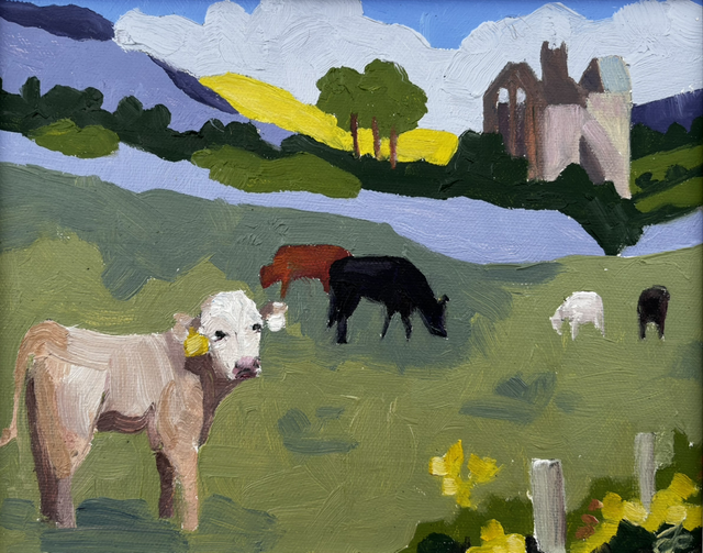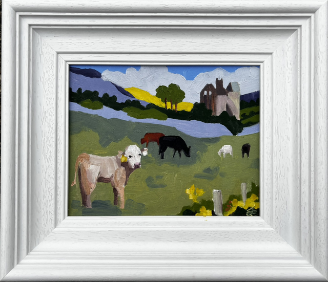 A charming seaside scene of a cute calf near Corcomroe Abbey. Inspired by the Burren in Co. Clare. Original oil painting by Irish artist Joanna Gammell. 8x10inch painting, framed size larger.